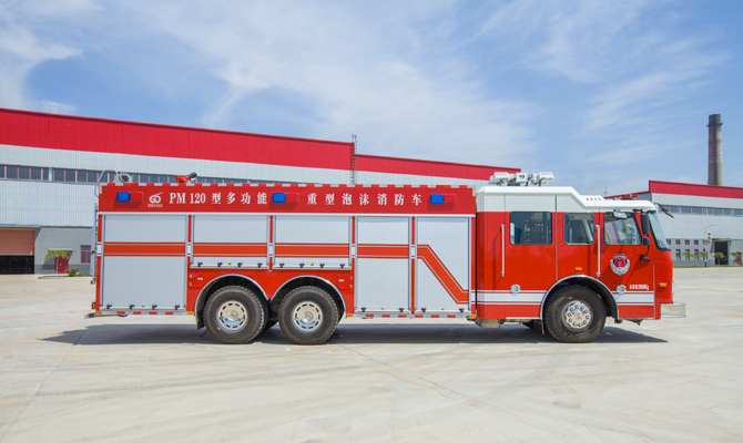 PM120 foam fire truck, American standard fire use special chassis, the cabin room can satisfy eight people aboard, the cabin roof install with aerodynamic lifting lamp, high intensity of built-in winch type bumper, Equipped with 5 ton electric winch, double series of battery and 6KW gasoline generator ensure vehicle no matter after the rescue operation or under bad weather conditions, still be able to start the engine, and will not cause excessive discharge affect the service life of the battery, compared with the commercial chassis, we will have A bigger vehicle equipment layout space, more reasonable, lower part space is greater than the commercial chassis is about 1.5m3.PM120 foam fire truck -