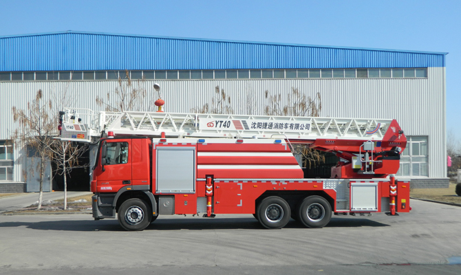 40m ladder fire truck, can achieve 360 degree full rotation straight ladder fire truck. Each performance mechanism adopts the electric control hydraulic drive, the operation is simple, the movement is flexible, the safety is reliable, the practicability is strong. Total 2 sets operating system: main operating console and manned platform. The ladder truck is equipped with advanced PLC computer automatic control system, which realizes the automatic deceleration and stop of the extreme position of each movement mechanism and ensures the safety of operation. The top of the ladder platform move with the ladder amplitude movement, automatic leveling lock, always maintain parallel with the ground. The platform is equipped with communication and water monitor fire extinguishing system, so that the ladder truck can work safely, stably and reliably in rescue operations. In addition, the vehicle is also equipped with a variety of fire fighting and rescue equipment fixed box and onboard equipment, so that the vehicle realized high altitude fire fighting, high altitude water tower and high altitude rescue function.40m ladder fire truck -