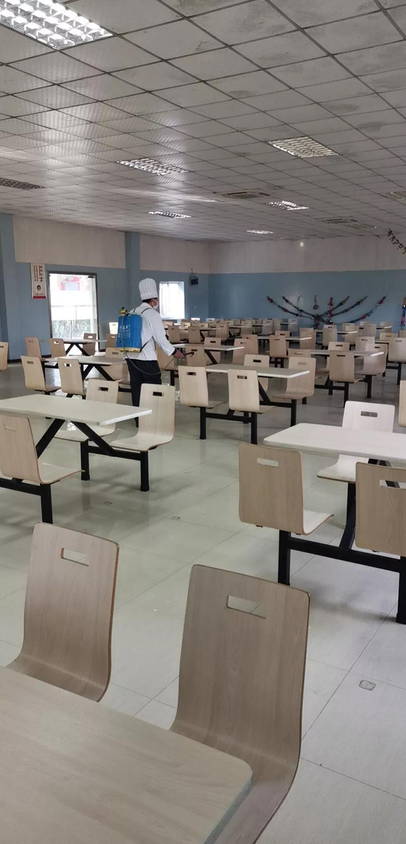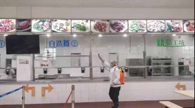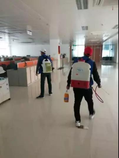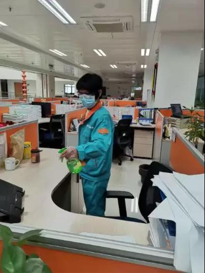 圖片內(nèi)容:對公司辦公區(qū)域、食堂、茶水間等地方進(jìn)行打掃及消毒,嚴(yán)格穿戴防護(hù)用具。
