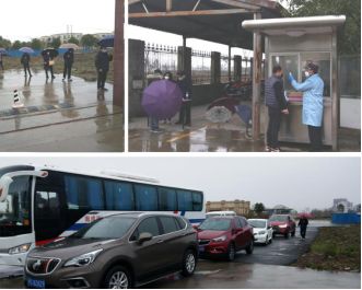 復(fù)工首日,上海金盾廠區(qū)門口車輛和人員有序排隊(duì),依次進(jìn)行體溫檢測(cè),領(lǐng)取通行證。